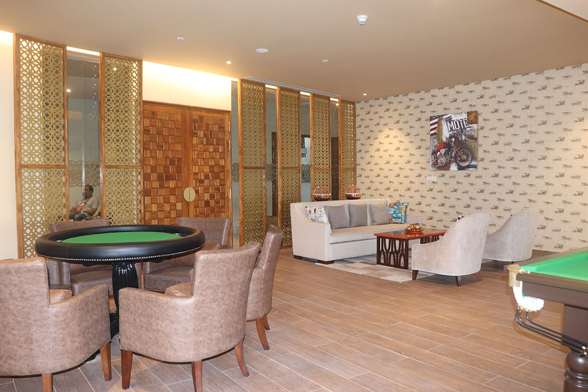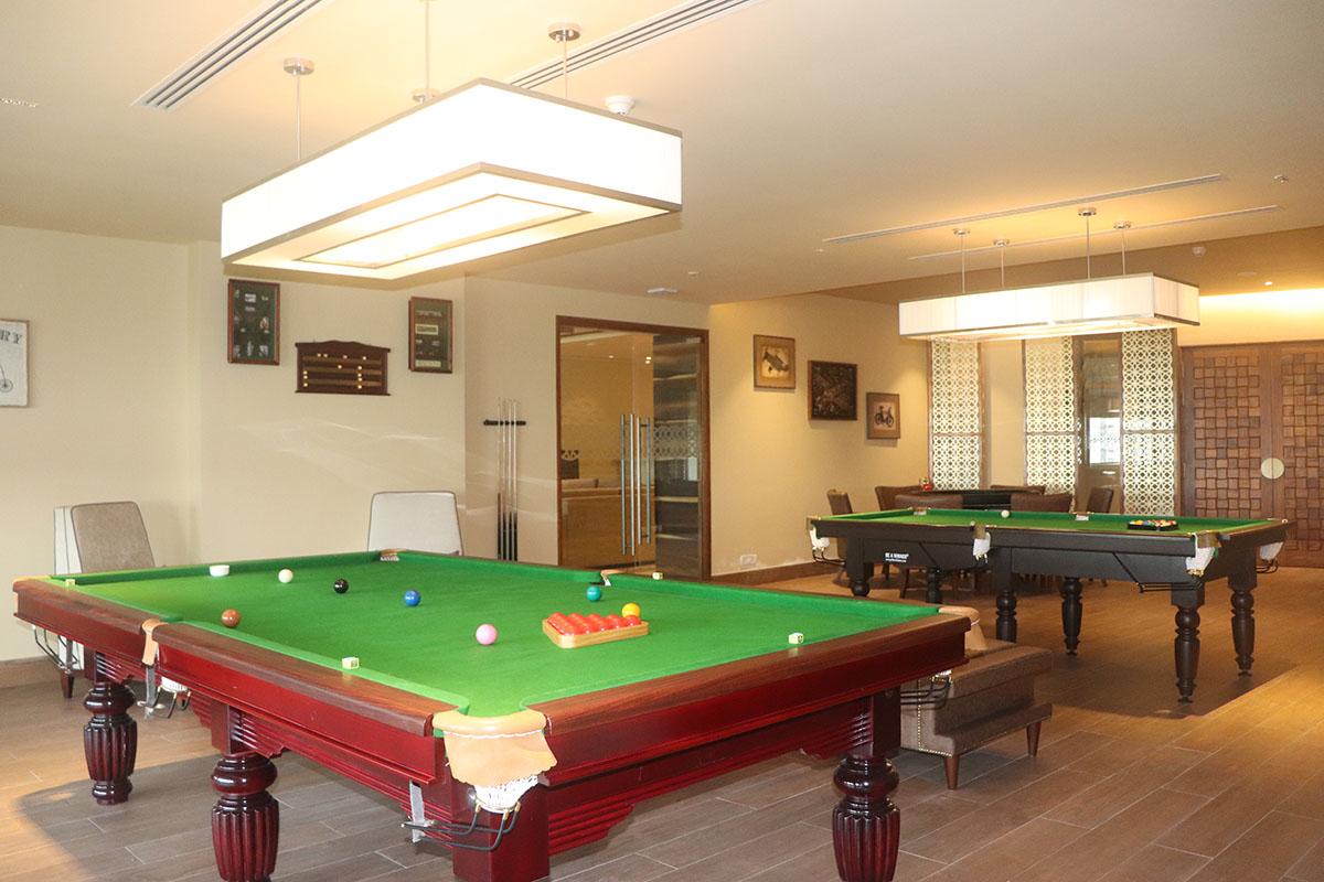 For recreation, the space offers a snooker and cards lounge with moody lighting, panelled walls, and deep-toned furniture—a classic gentleman’s club vibe reimagined for modern living. Adjacent to it is a mini-theatre, equipped with recliner seating, acoustic wall treatments, and a cinematic atmosphere for private screenings.