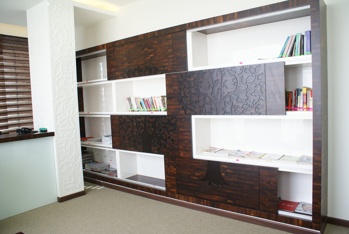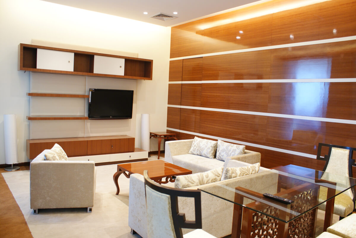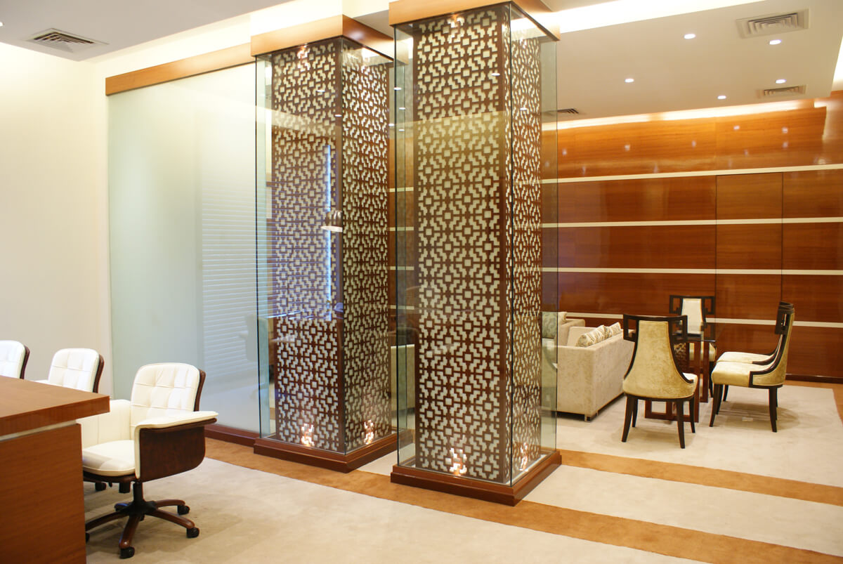 Richly grained wood panelling with inlaid detailing sets the tone in the executive areas, offering a refined backdrop that exudes both gravitas and grace. The use of classic motifs—like the intricate jali-style glass screens—introduces a heritage element while maintaining transparency and openness across spaces.