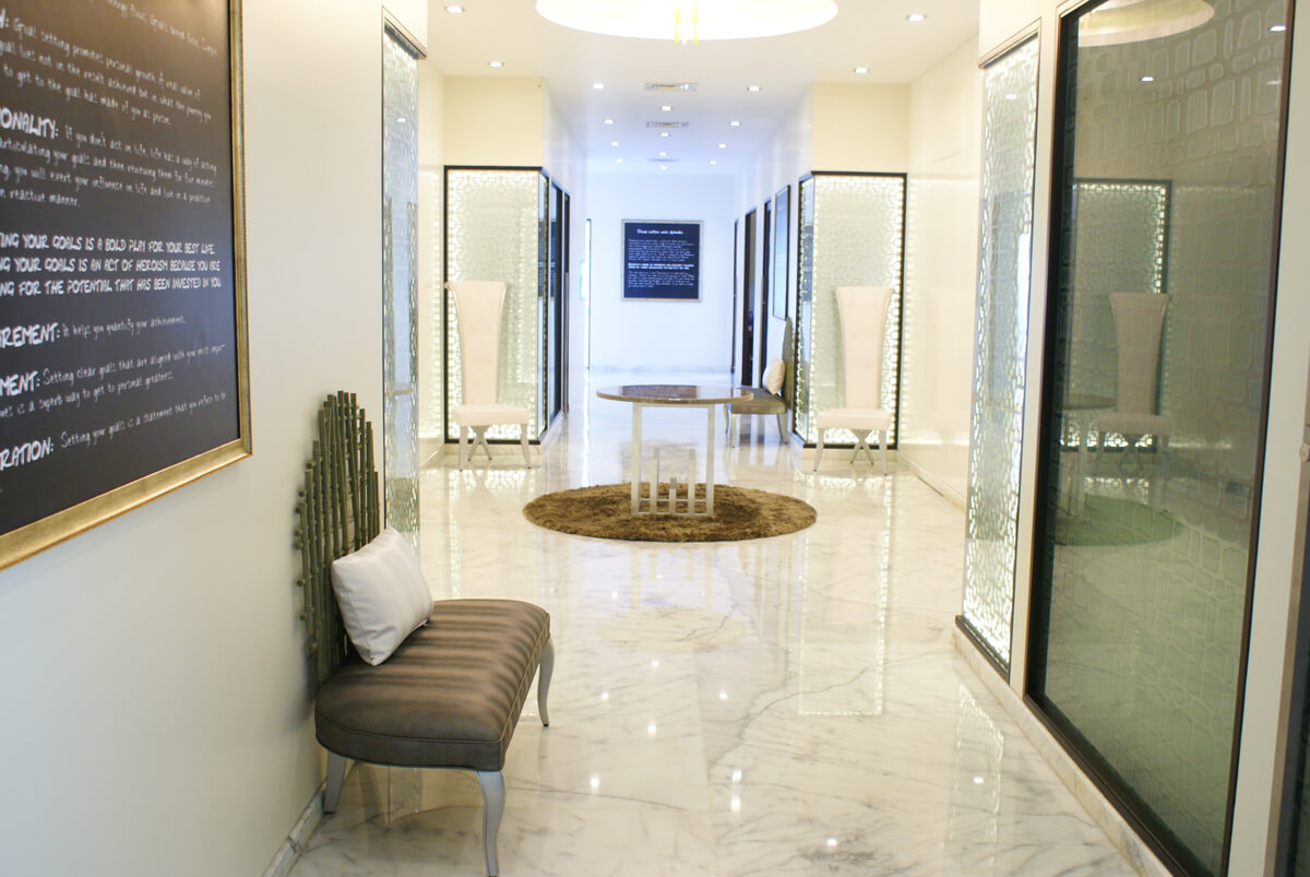 The corridor, adorned with high-gloss marble flooring and antique-finished furniture, elevates the spatial experience, evoking the feel of a private gallery. Muted gold wallpaper, contemporary art, and sculptural lighting further enhance the ambience—subtle and serene, yet undeniably luxurious.