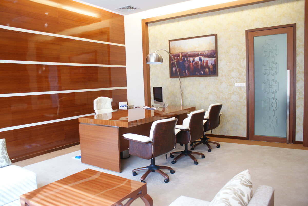 This high-end office interior embodies quiet luxury with a nod to traditional Indian elegance—an environment designed not only for productivity but also for timeless inspiration.