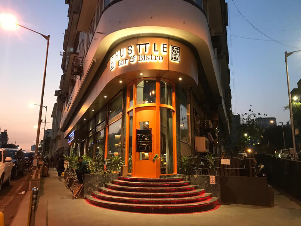 Set at a buzzing crossroads in Mumbai, Hustle Bar & Bistro is where industrial edge meets vintage flair—designed to energize both nightlife and live music lovers. The bold, curved glass façade with warm orange framing invites you in with dramatic red-lit steps, setting the tone for a vibrant experience inside.