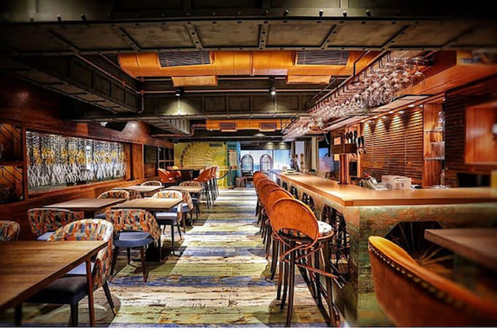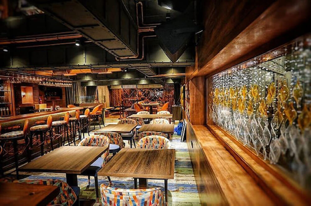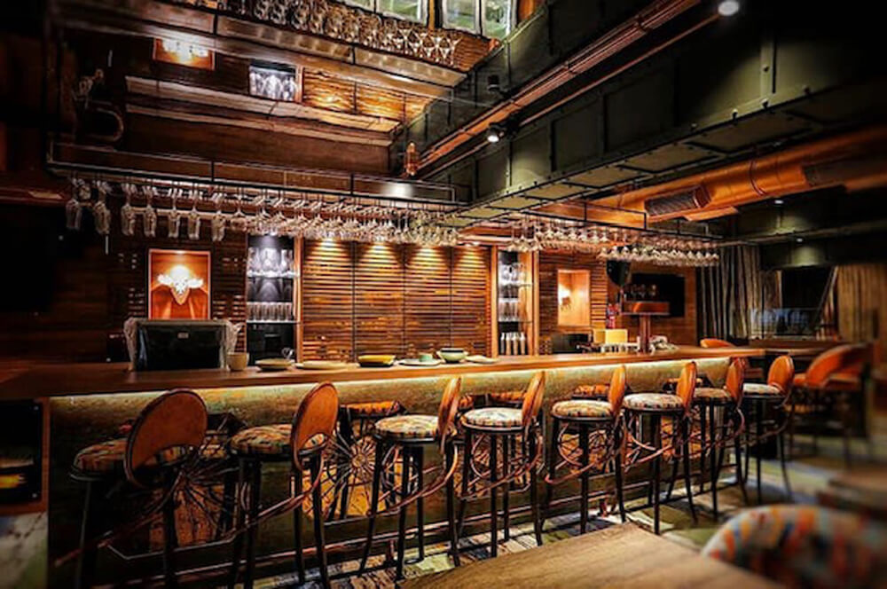The interiors are moody and magnetic, with exposed ducts, dark timber walls, and layered lighting that casts an inviting glow. A sprawling central bar with custom graphic bar stools and suspended glass racks becomes the heart of the space, while the colorful patchwork seating and eclectic flooring add playful character. Raw textures, ambient lighting, and cleverly zoned seating make this the perfect venue for unwinding over cocktails or catching live acts in a space that feels both curated and unpretentious