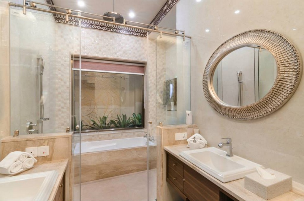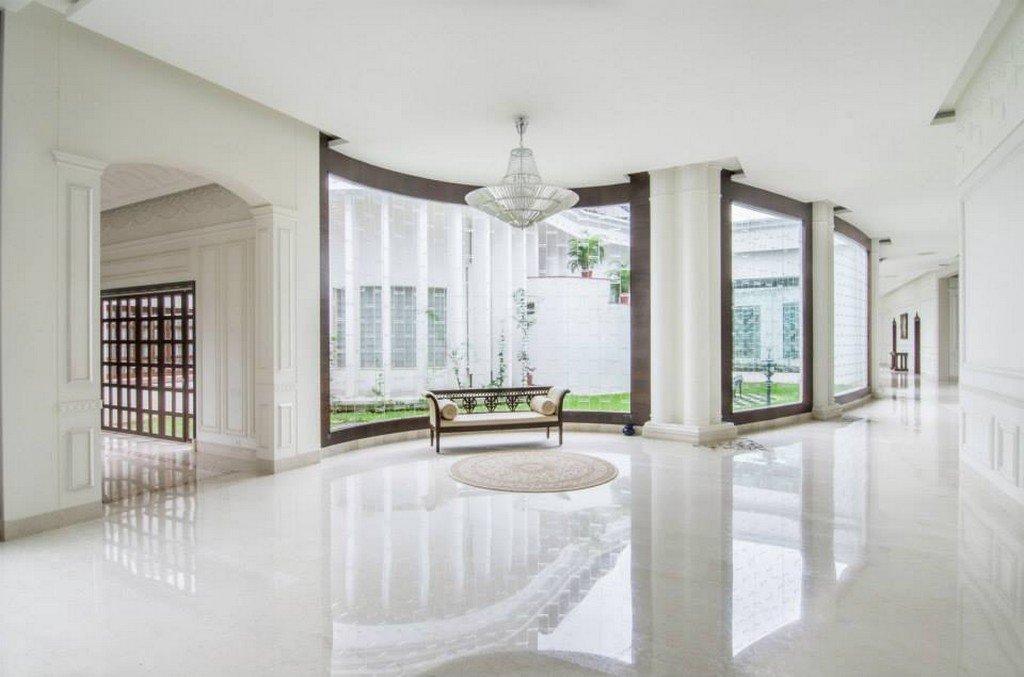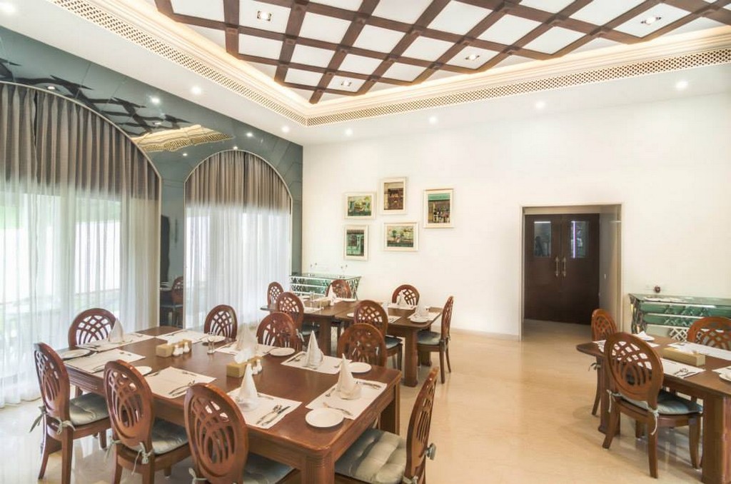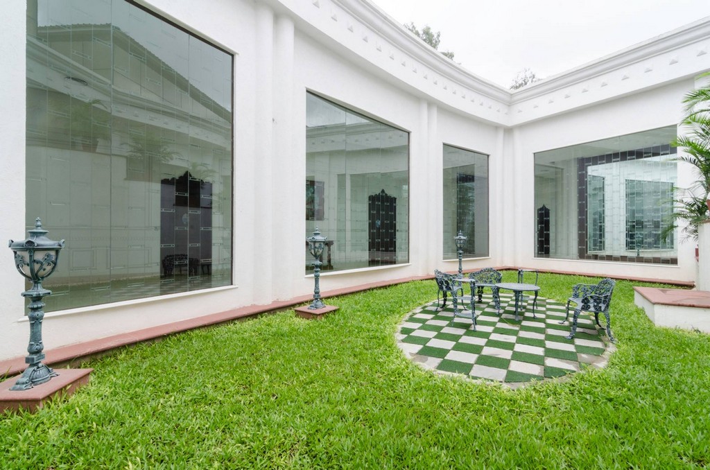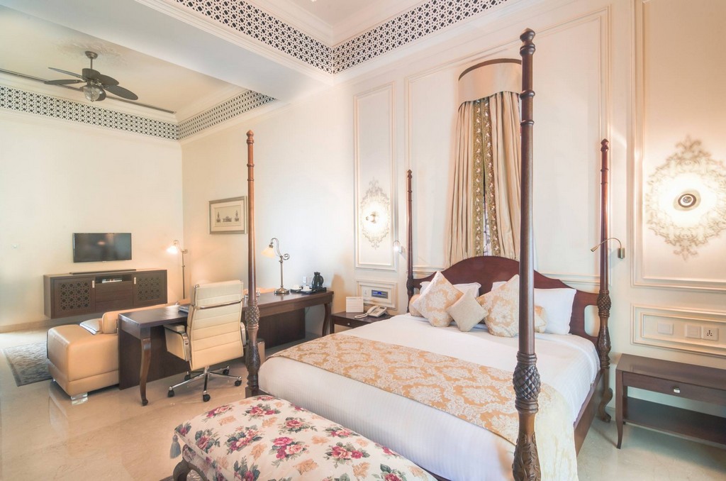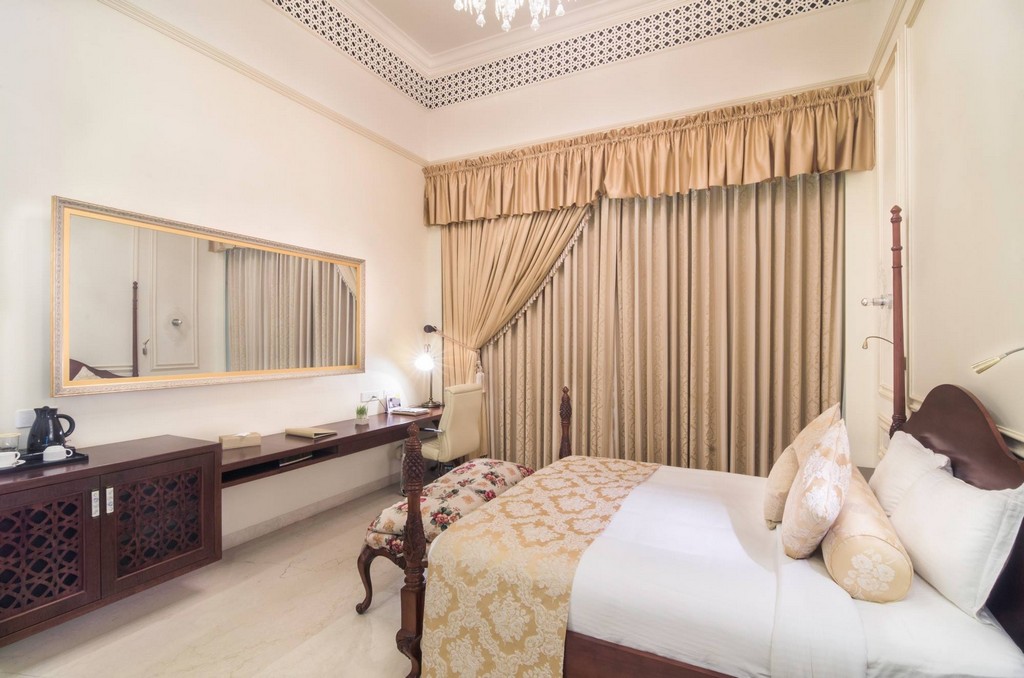 The interiors of this distinguished club reflect regal elegance with a refined nod to classical Indian heritage. The guest suite is adorned with intricately carved four-poster beds, soft golden damasks, and traditional jaali ceiling panels that blend luxury with heritage charm. Thoughtfully integrated workspaces and vintage-inspired lighting strike a perfect balance between comfort and sophistication.