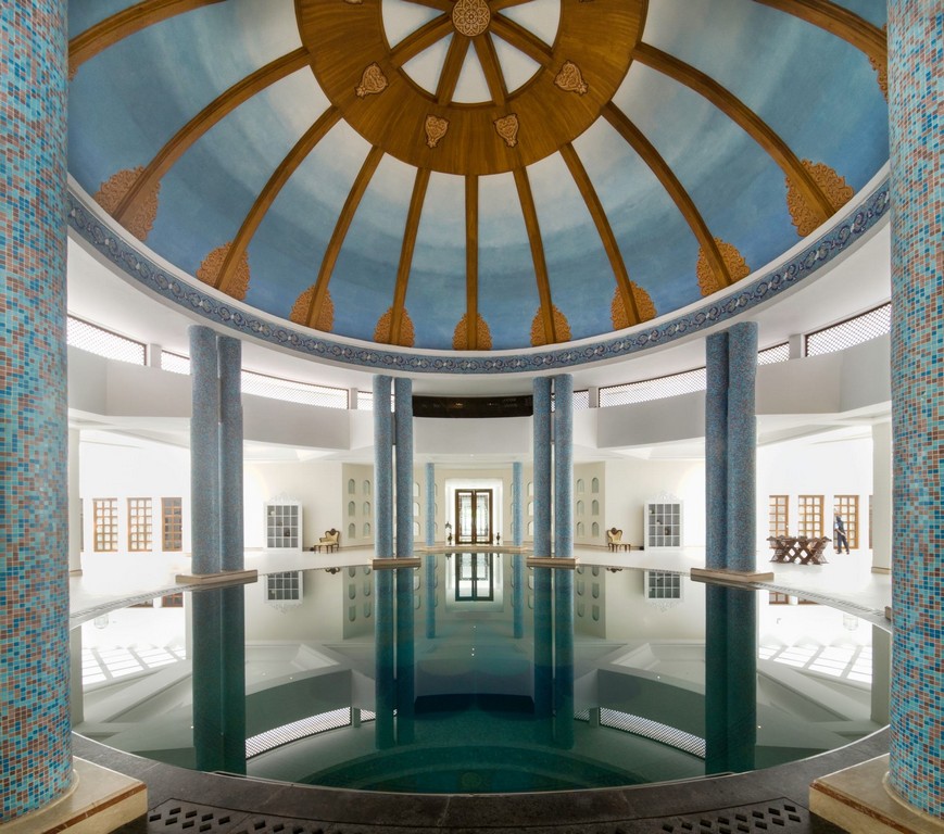 The wellness area, crowned by a breath-taking domed ceiling hand-painted to mimic the sky, is framed by majestic blue mosaic columns that encircle a serene indoor pool. The design evokes the grandeur of royal bathhouses—offering members an oasis of calm, grace, and architectural splendour. A space where heritage is honoured in every detail, and leisure feels timeless.