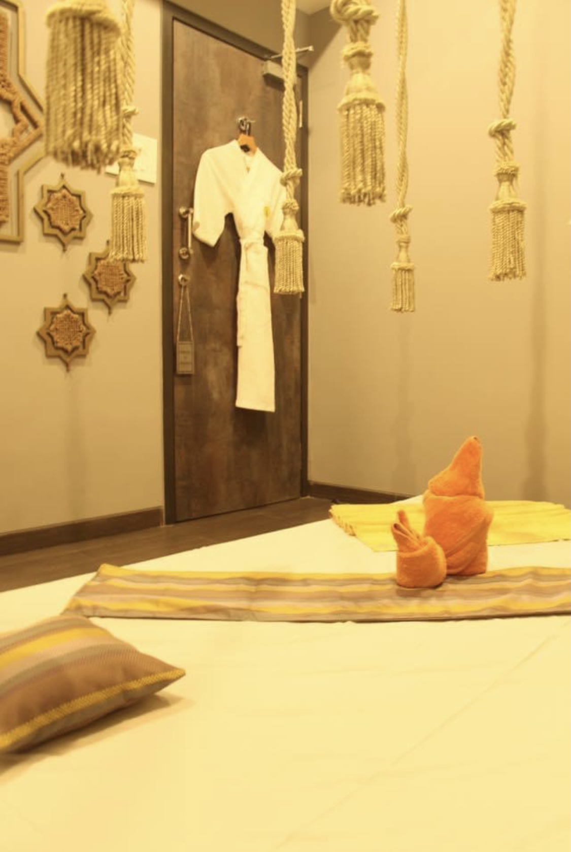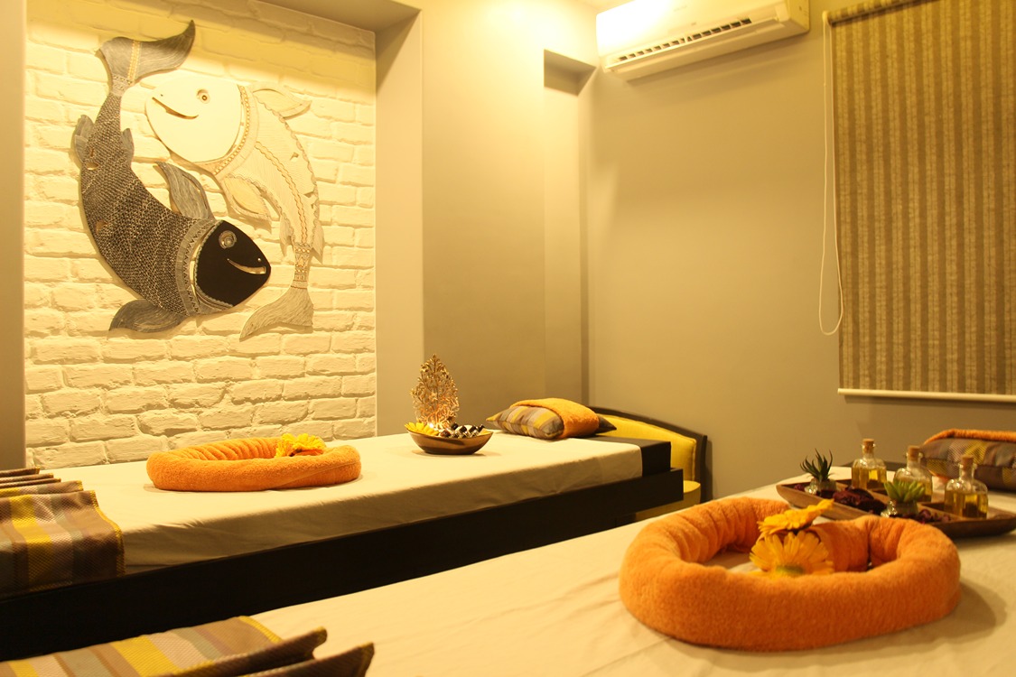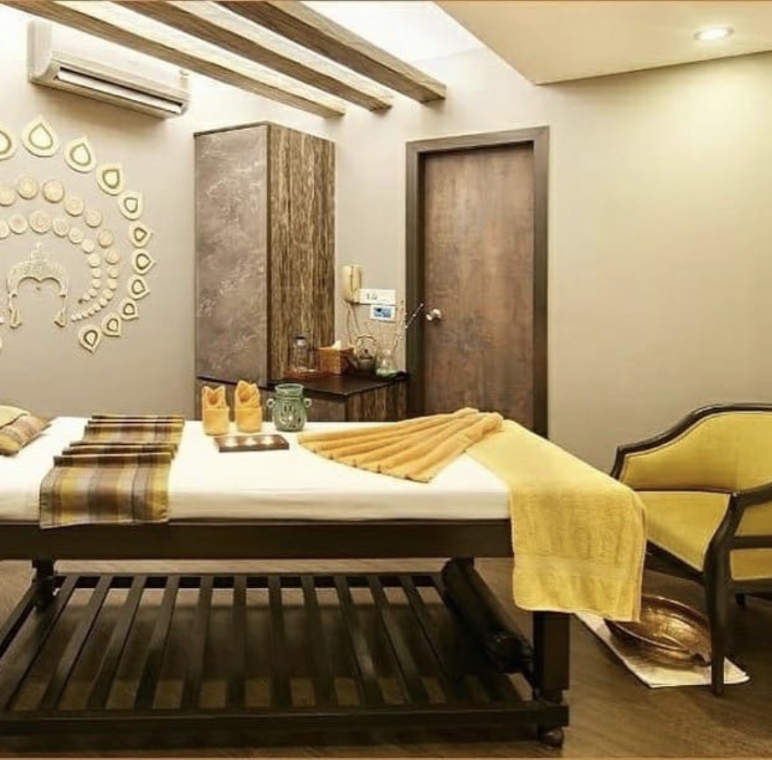 Each therapy room is thoughtfully curated with a distinct visual theme—be it handcrafted tassels echoing Kerala’s ritualistic charm or intricate wall mandalas suggesting meditative symmetry. Brick-textured walls and soft ambient lighting maintain a cocoon-like feel, while accents like folded towel art, brass thalis, and essential oil displays enrich the sensory experience.