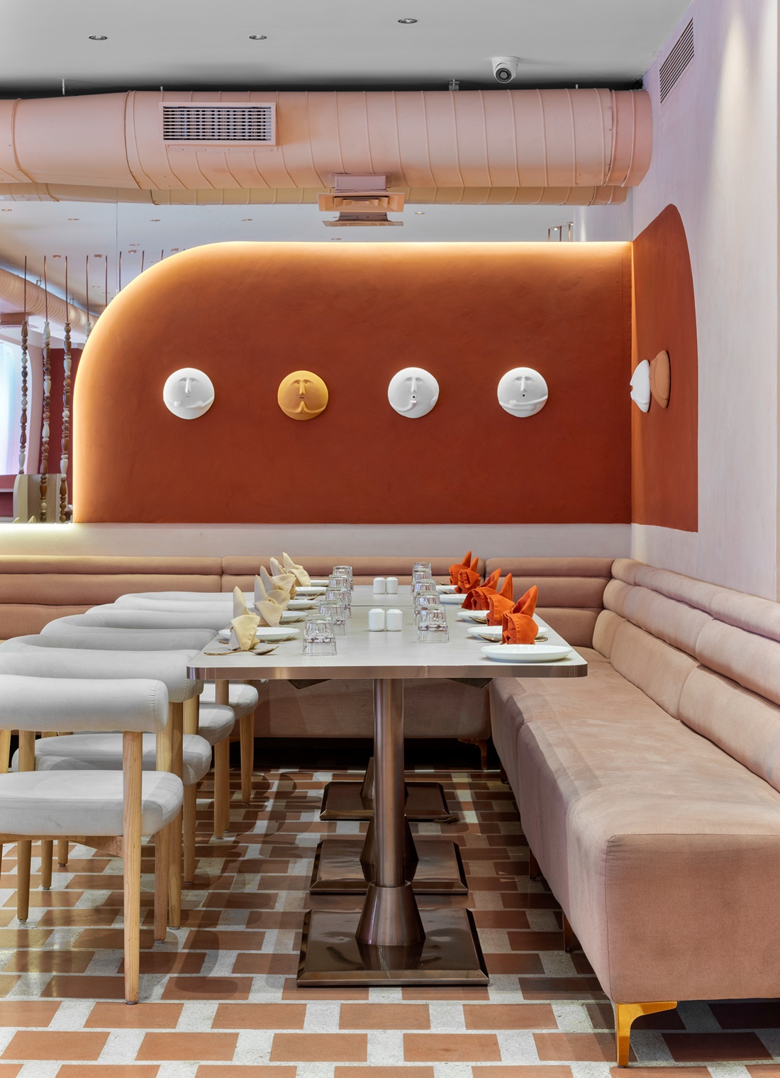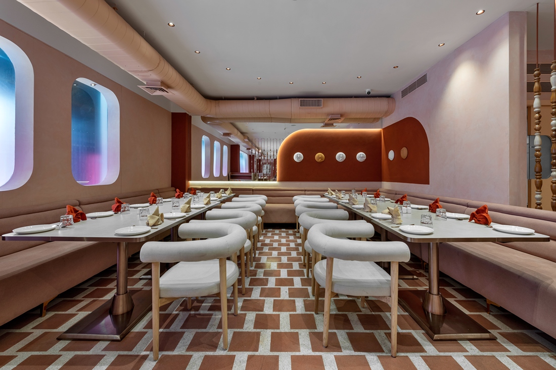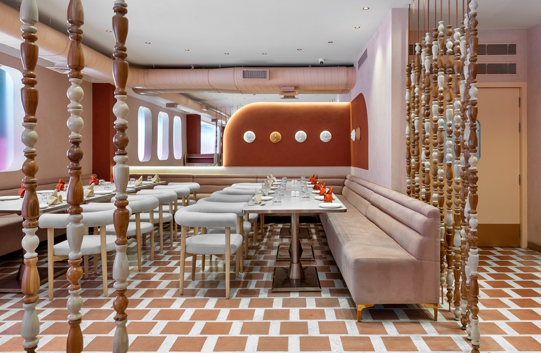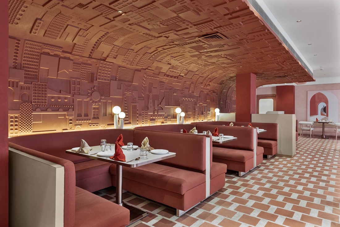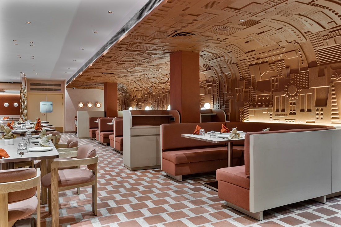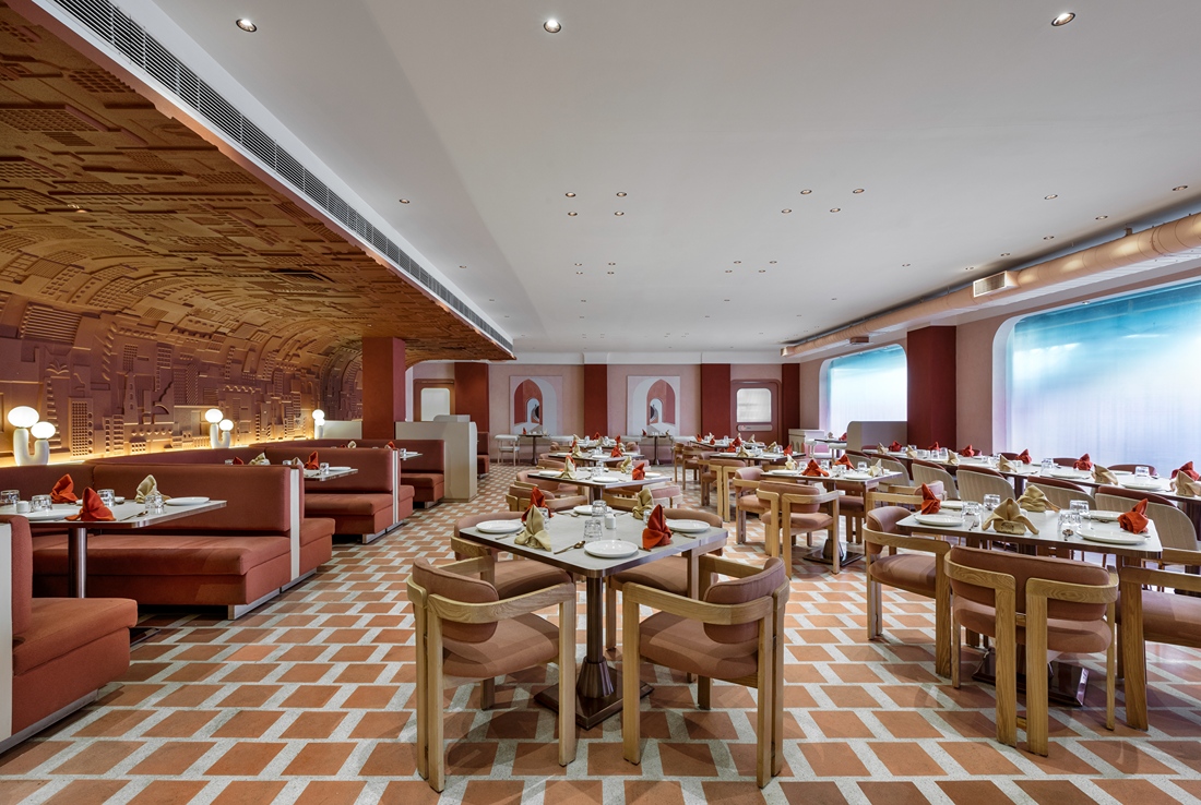 This all -day diner harmonises its name and location through a design that’s understated yet full of nuance—balancing natural warmth with polished elegance in a way that feels authentic to Vapi. Earth-toned sophistication of varying vibes which blend rust, peach, dusky orange and creamy wood tones harmoniously through different design elements such as the furniture, flooring patterns and designer fretwork screens. The monochromatic colour scheme feels different at all times of the day.